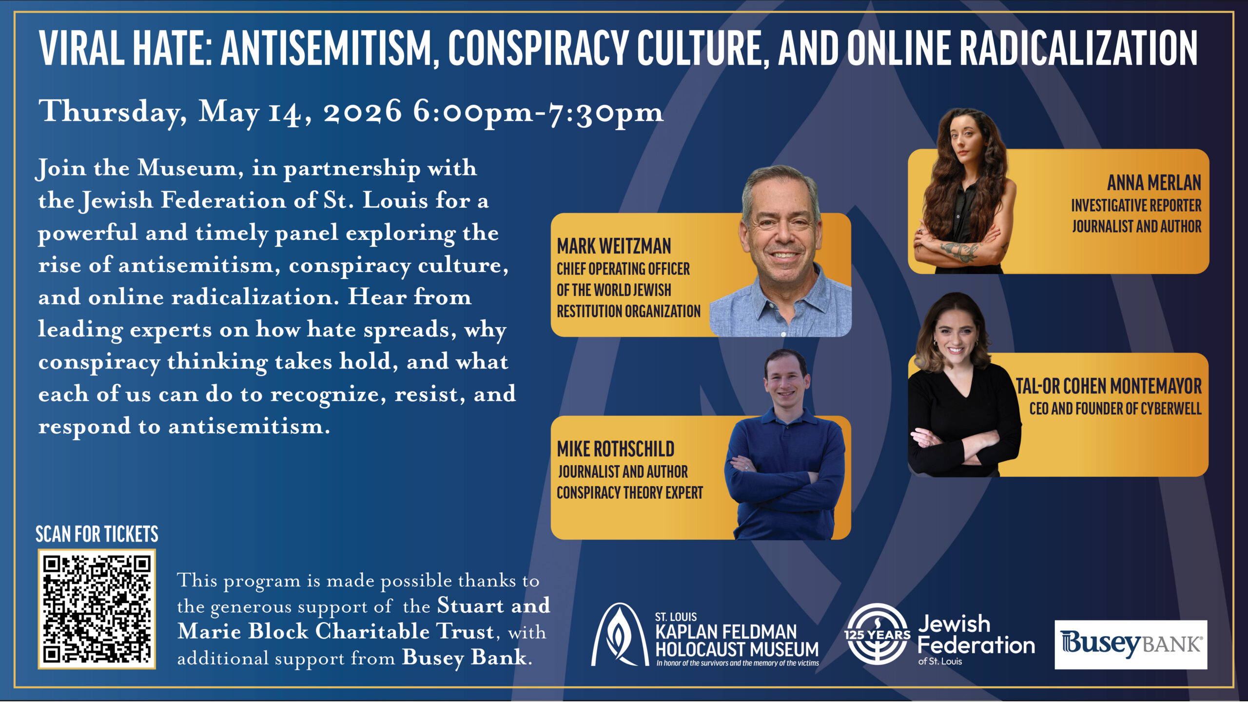 Join the Museum, in partnership with the Jewish Federation of St. Louis, for a powerful panel on the surge of antisemitism, conspiracy culture, and online radicalization. Hear from leading experts on how hate spreads, why conspiracy thinking takes hold, and what each of us can do to recognize, resist, and respond to antisemitism. Moderator: Mark Weitzman is...